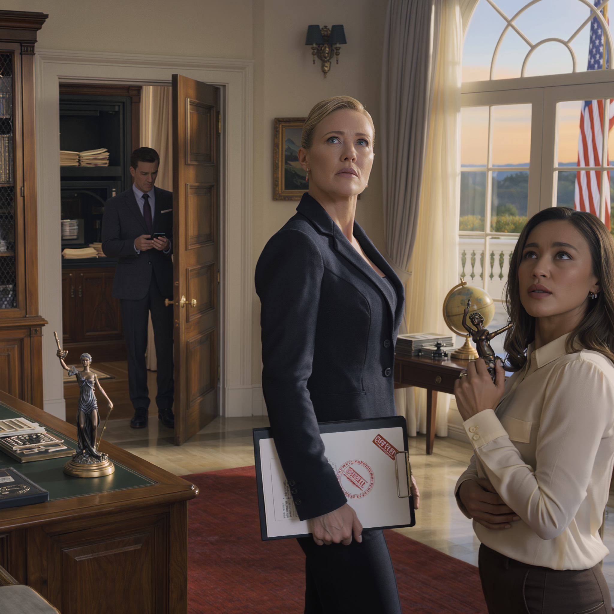During dessert, I asked to use the powder room. The housekeeper showed me the way, but I “accidentally” turned down the wrong hall and found myself by a set of doors. One was ajar, and I heard agitated voices inside.