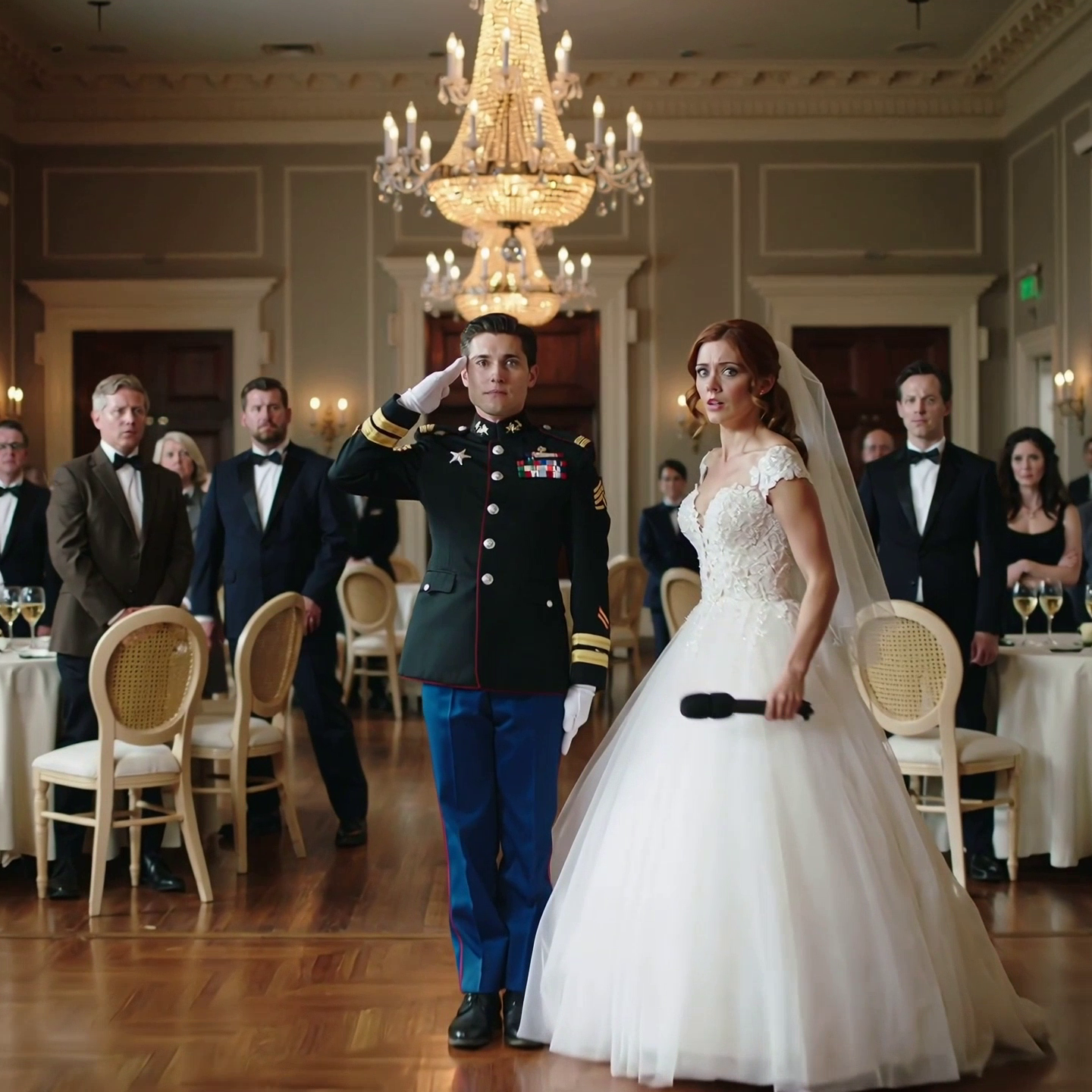 She stood. Not in anger; anger narrows a room. She stood the way she rose from a briefing: straight-backed, breath low, shoulders soft. Across the ballroom, Andrew Foster was already watching her. The groom. Crisp dress uniform. West Point manners. The cut of a man who took duty like a personal oath. He had not laughed.