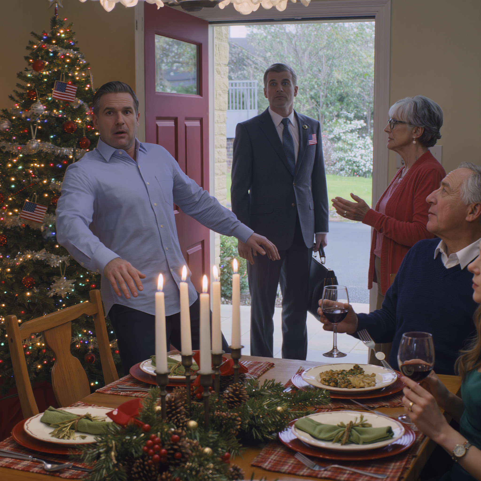 Nobody moves. Outside, wind rattles the windows. The Christmas tree lights blink in the living room—red, green, gold, red, green, gold.